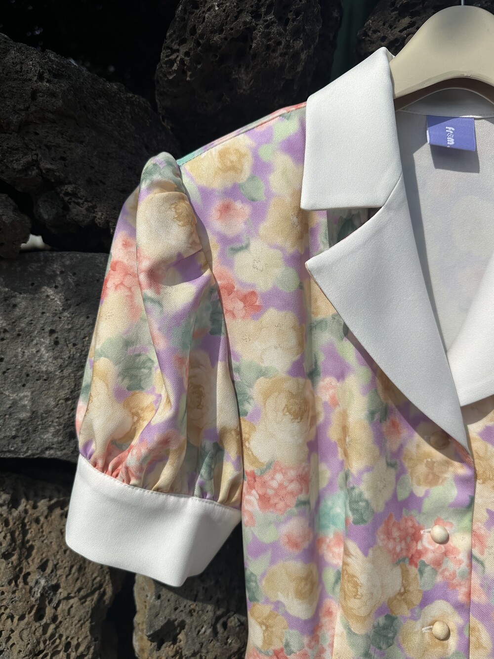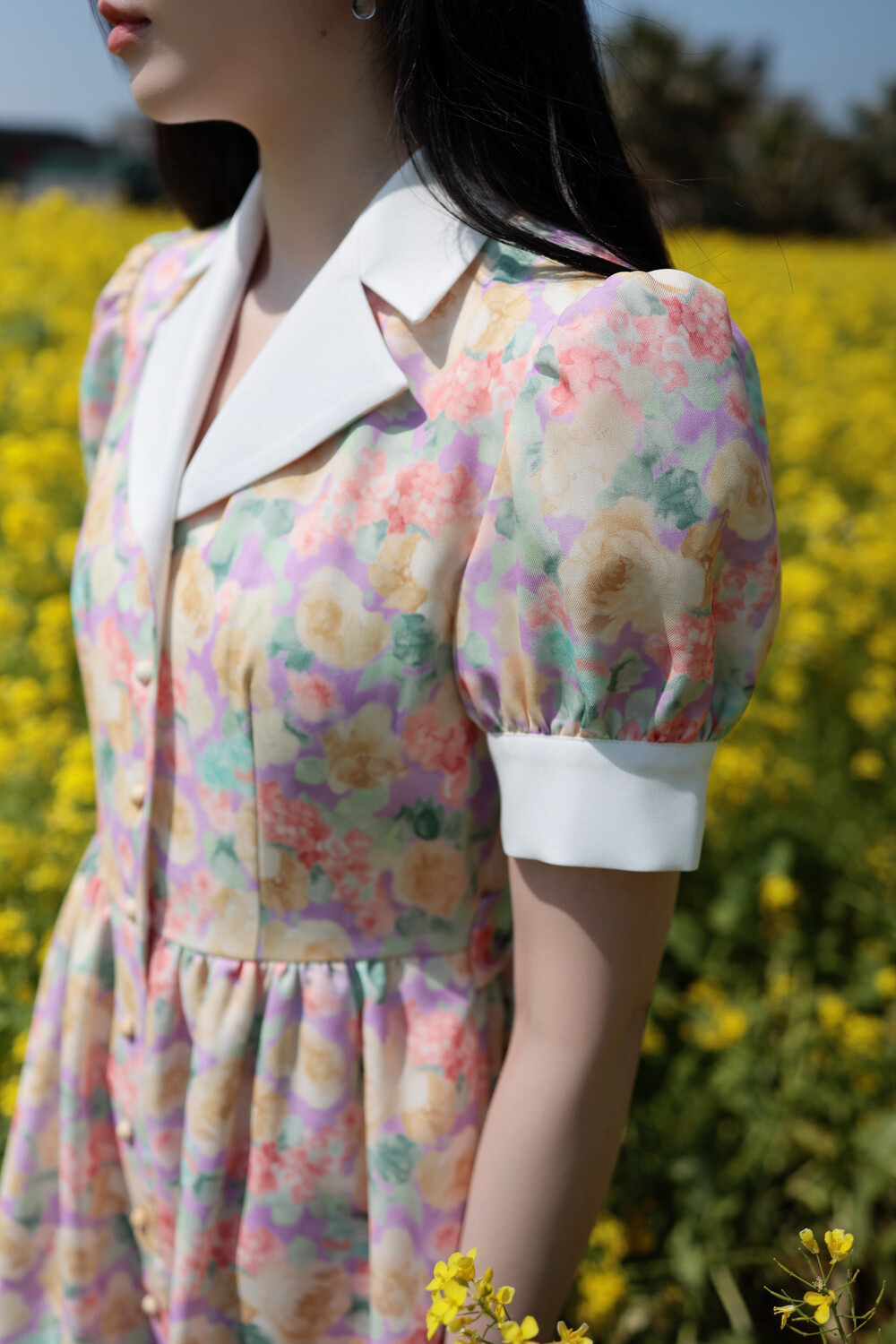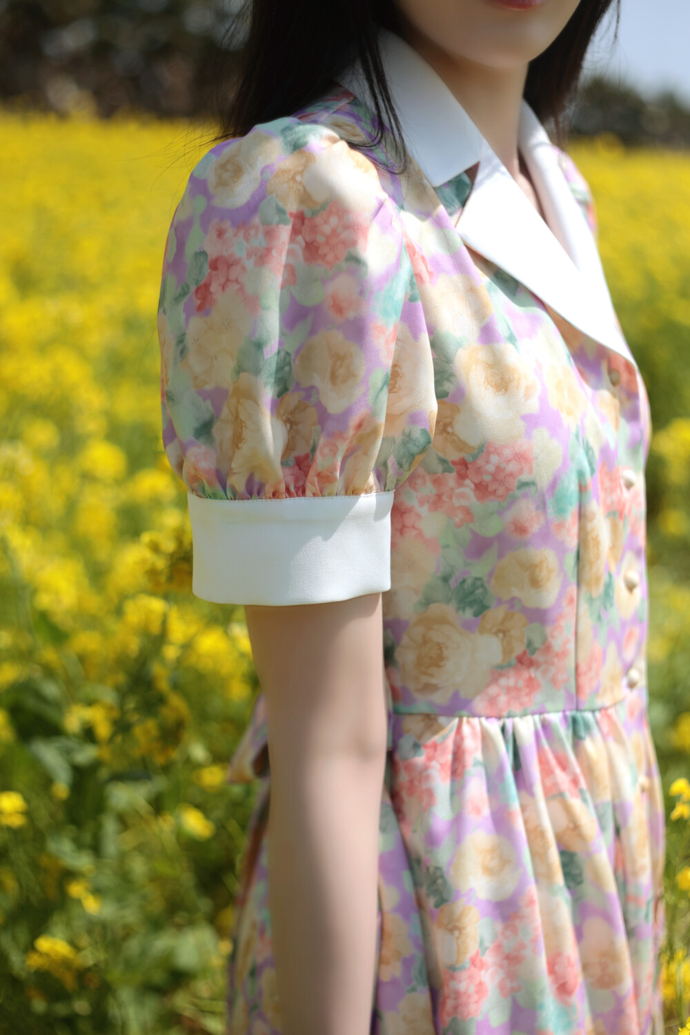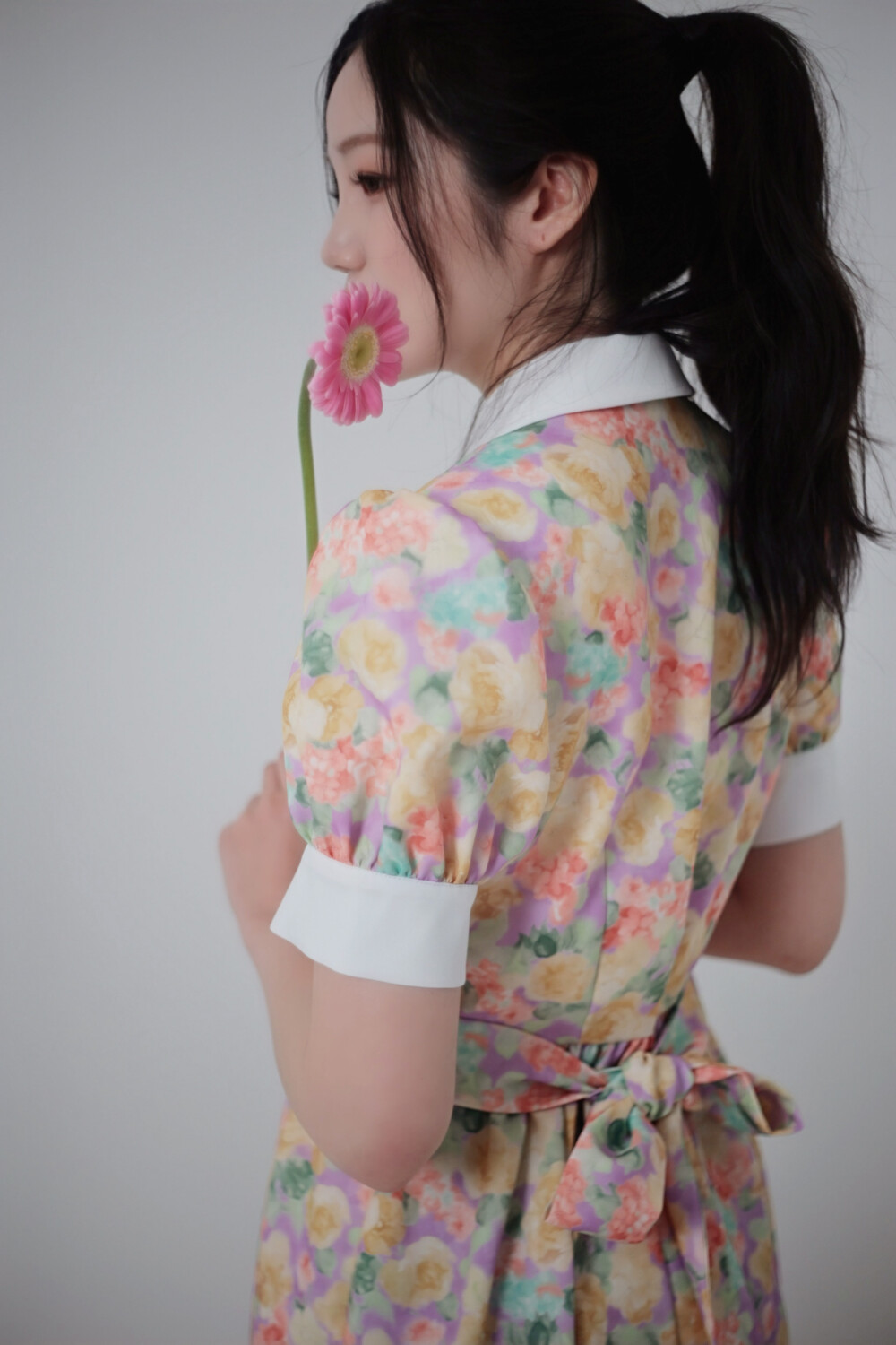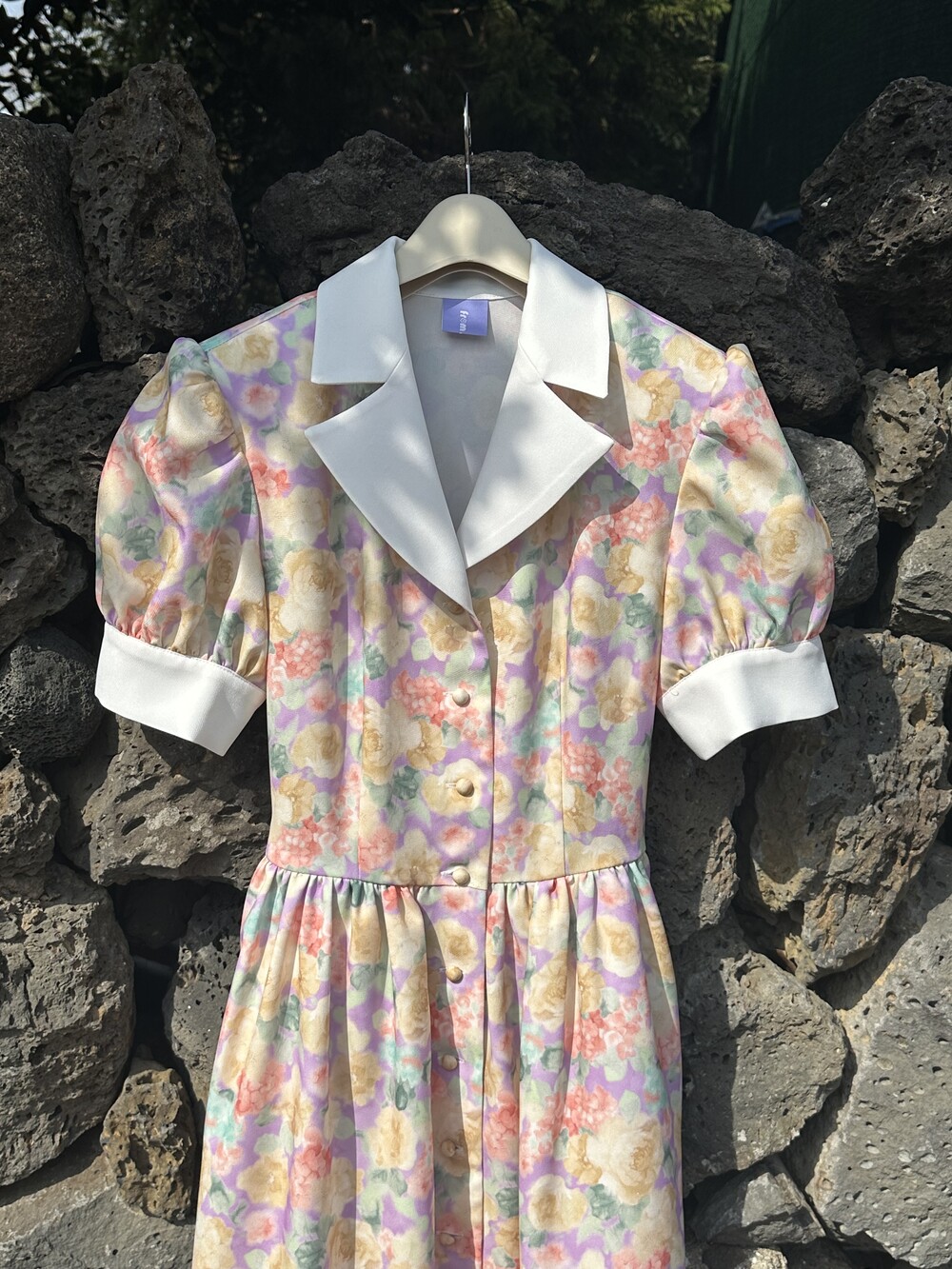 디자인 특징: 퍼프 소매, 허리끈 조절 가능, 빈티지 느낌의 카라 디테일