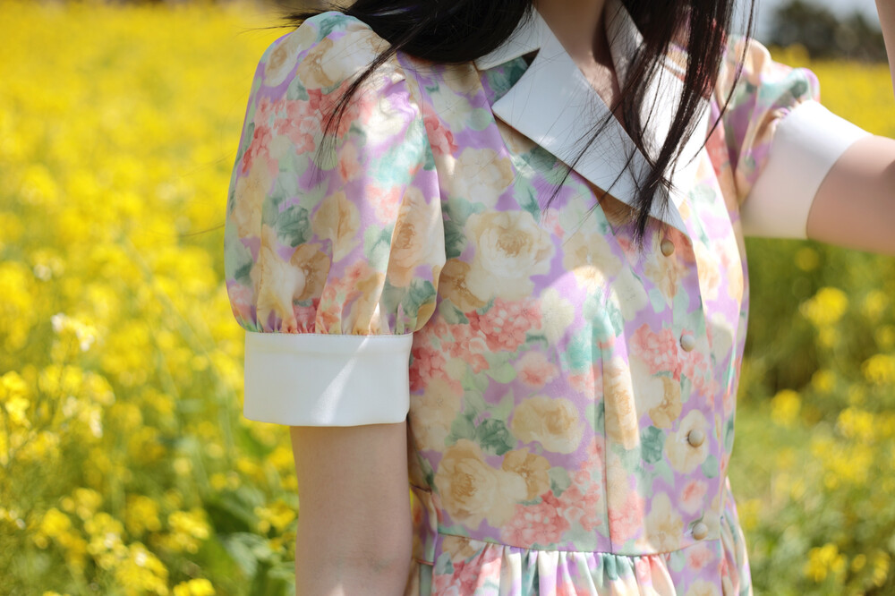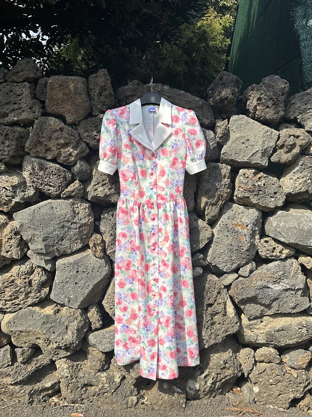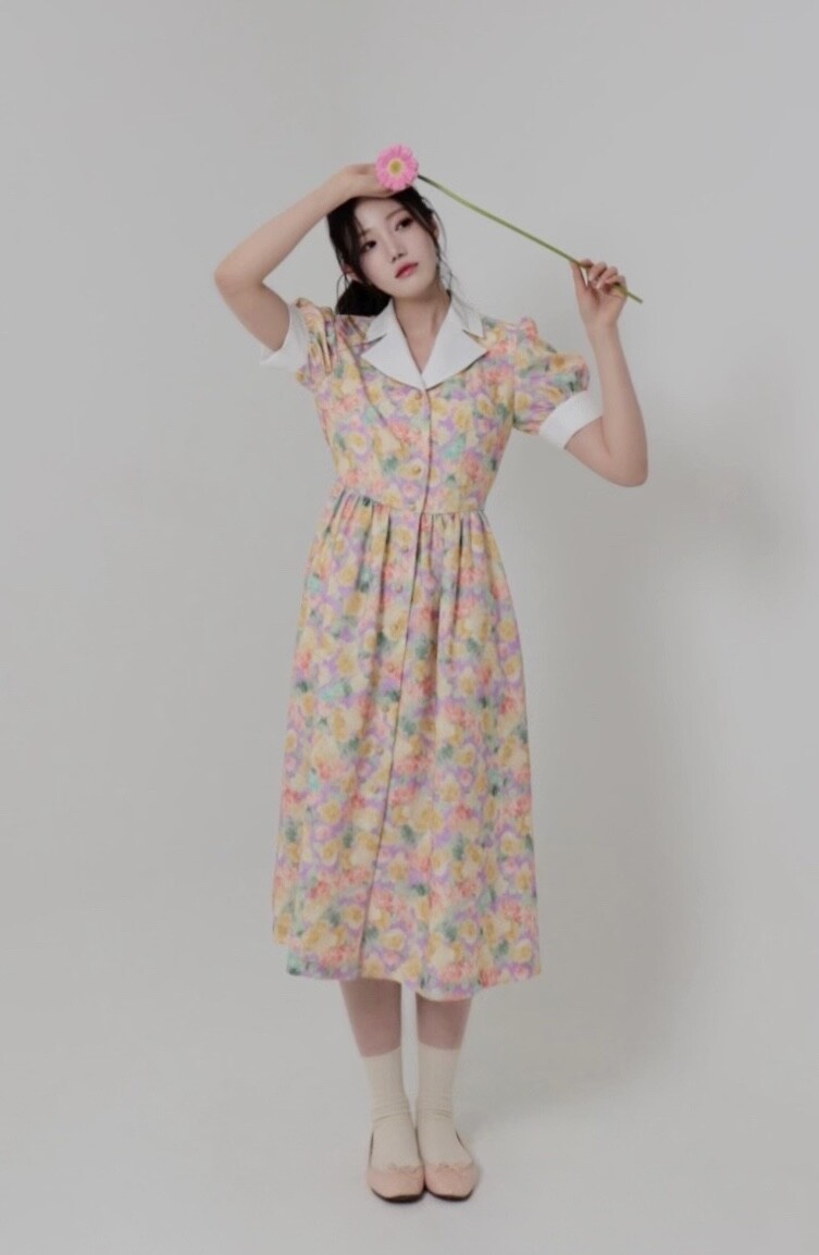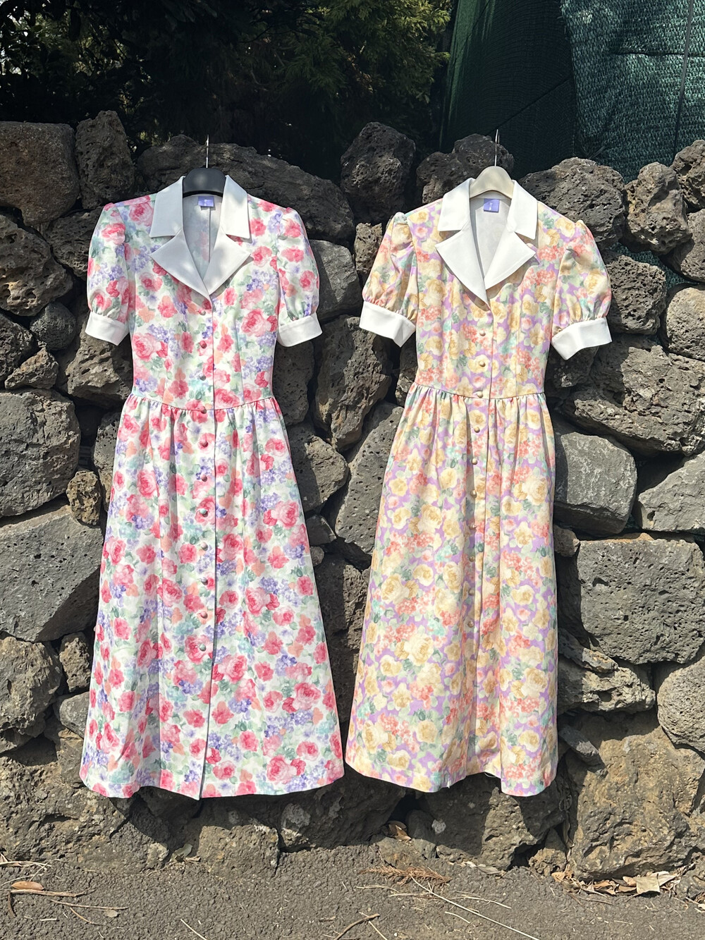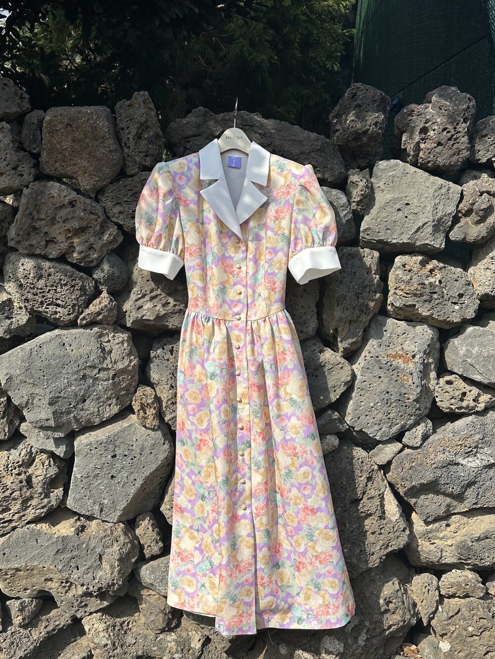 디자인 특징: 퍼프 소매, 허리끈 조절 가능, 빈티지 느낌의 카라 디테일