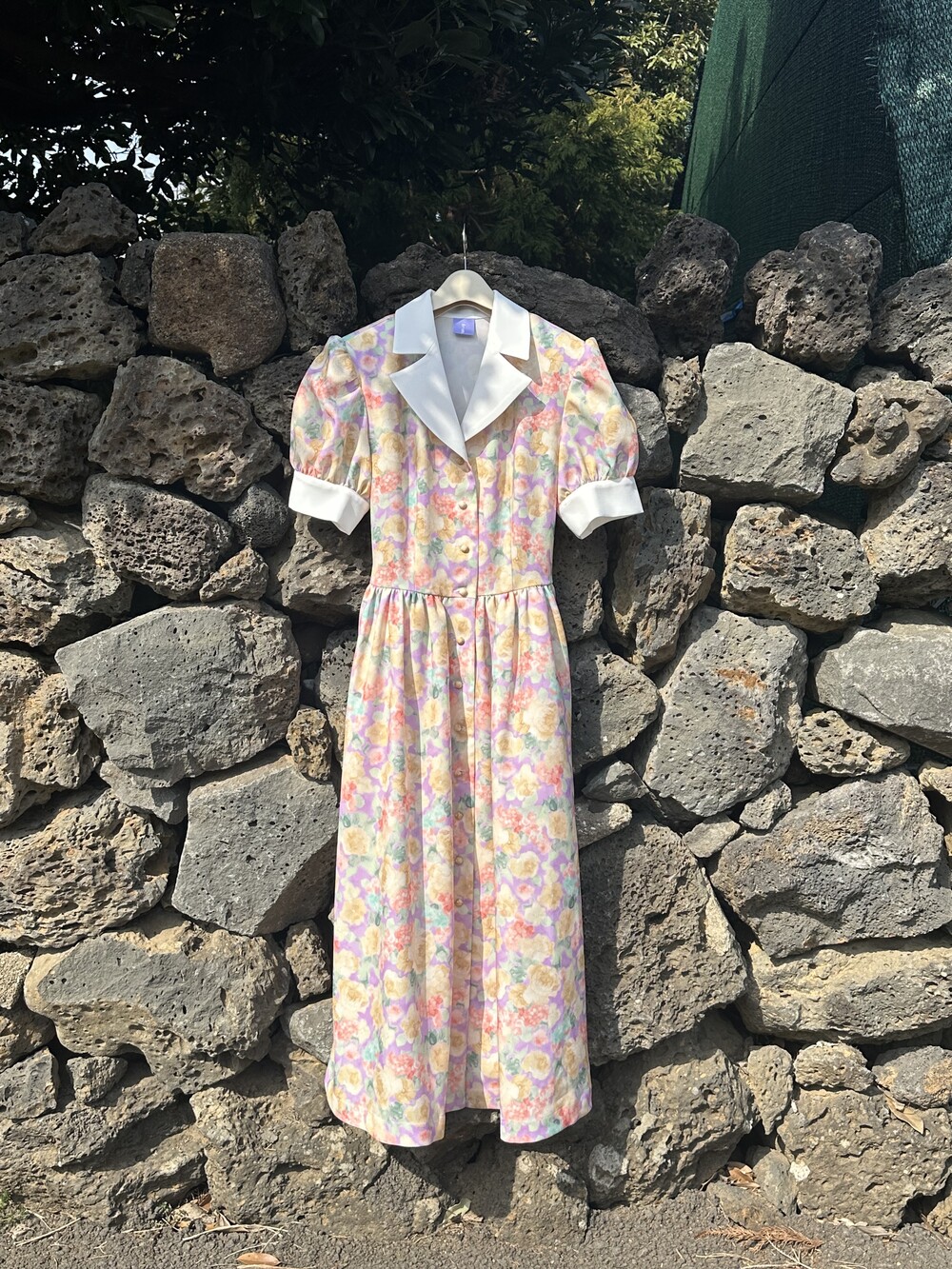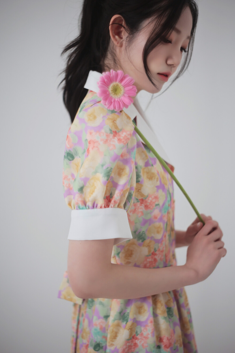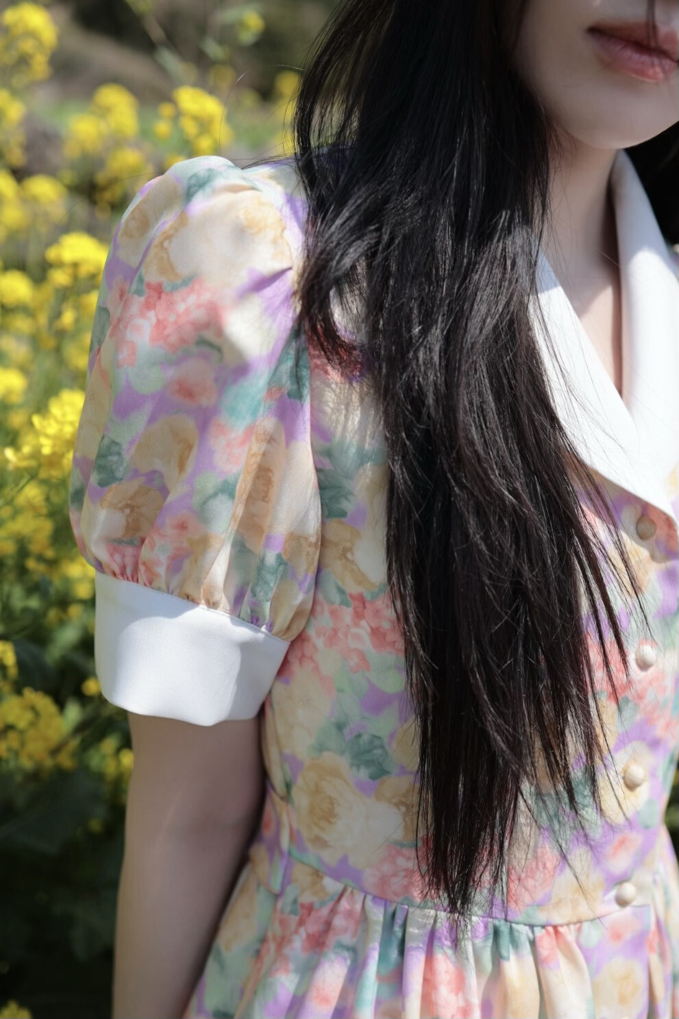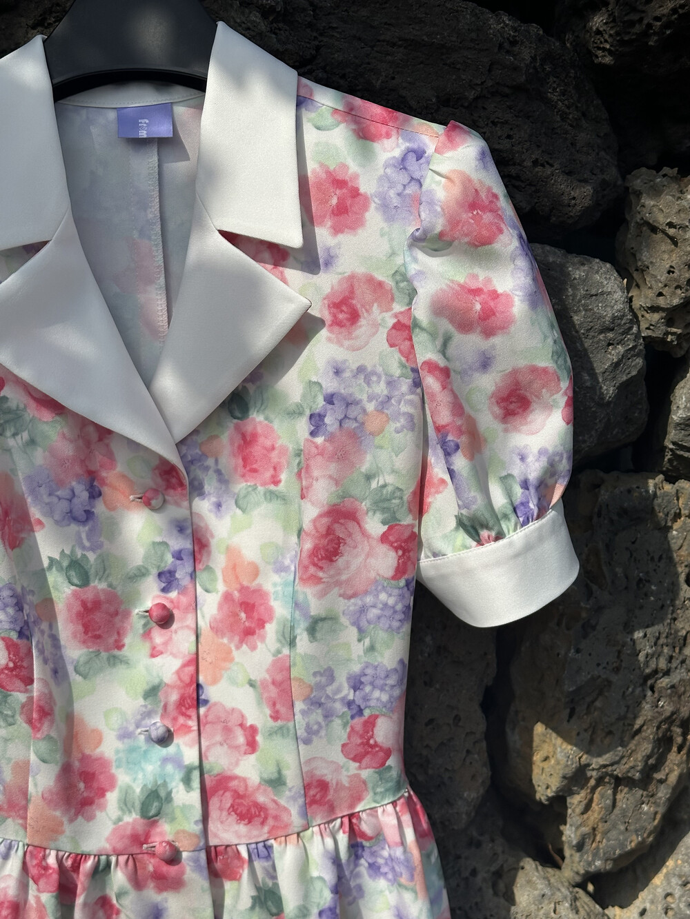 디자인 특징: 퍼프 소매, 허리끈 조절 가능, 빈티지 느낌의 카라 디테일