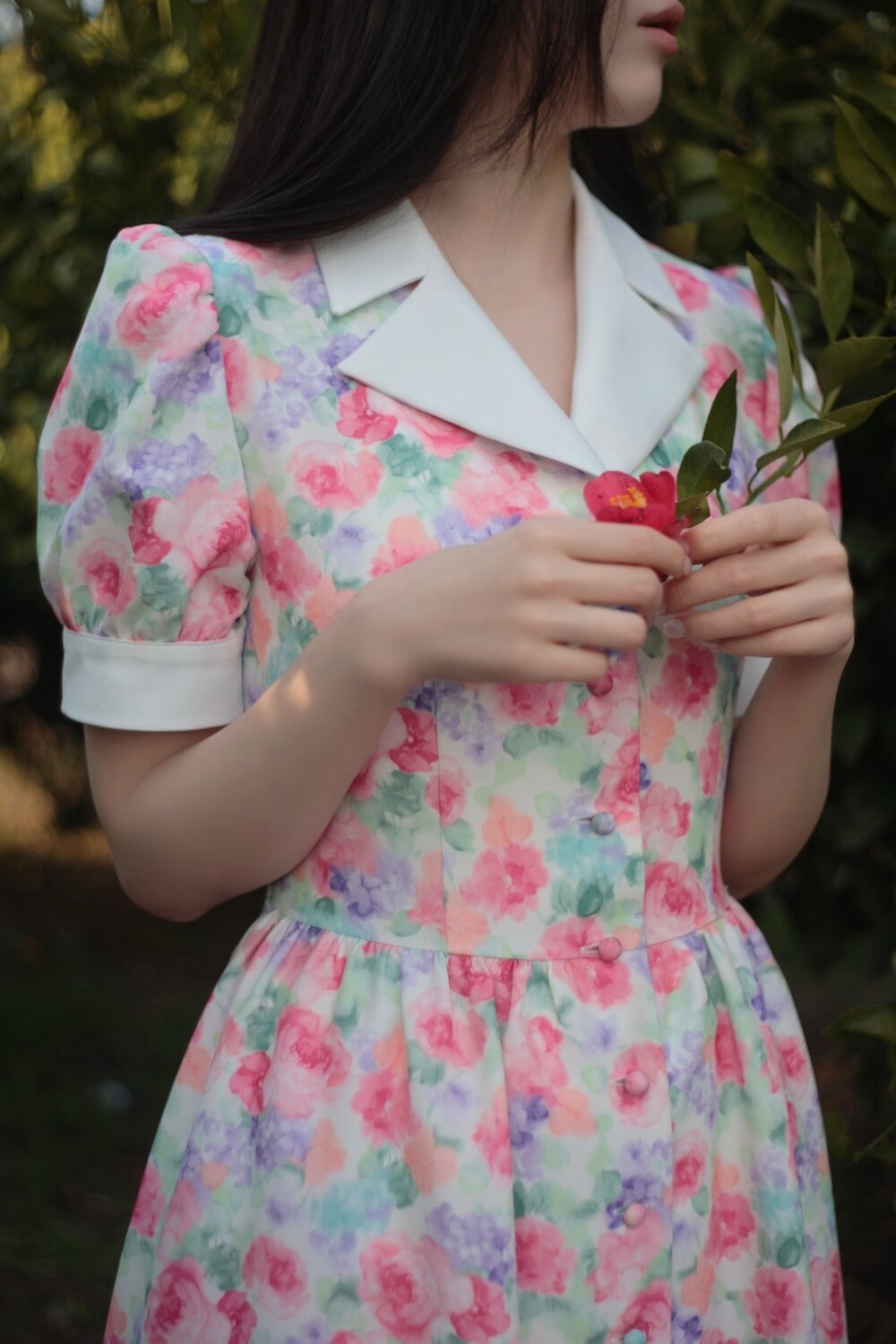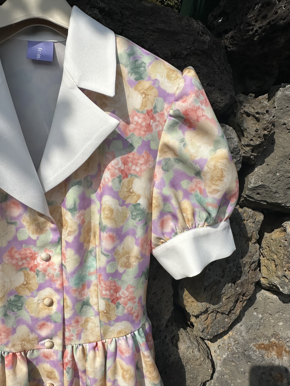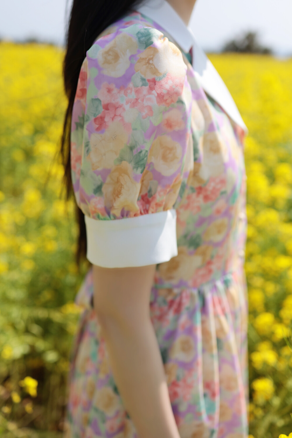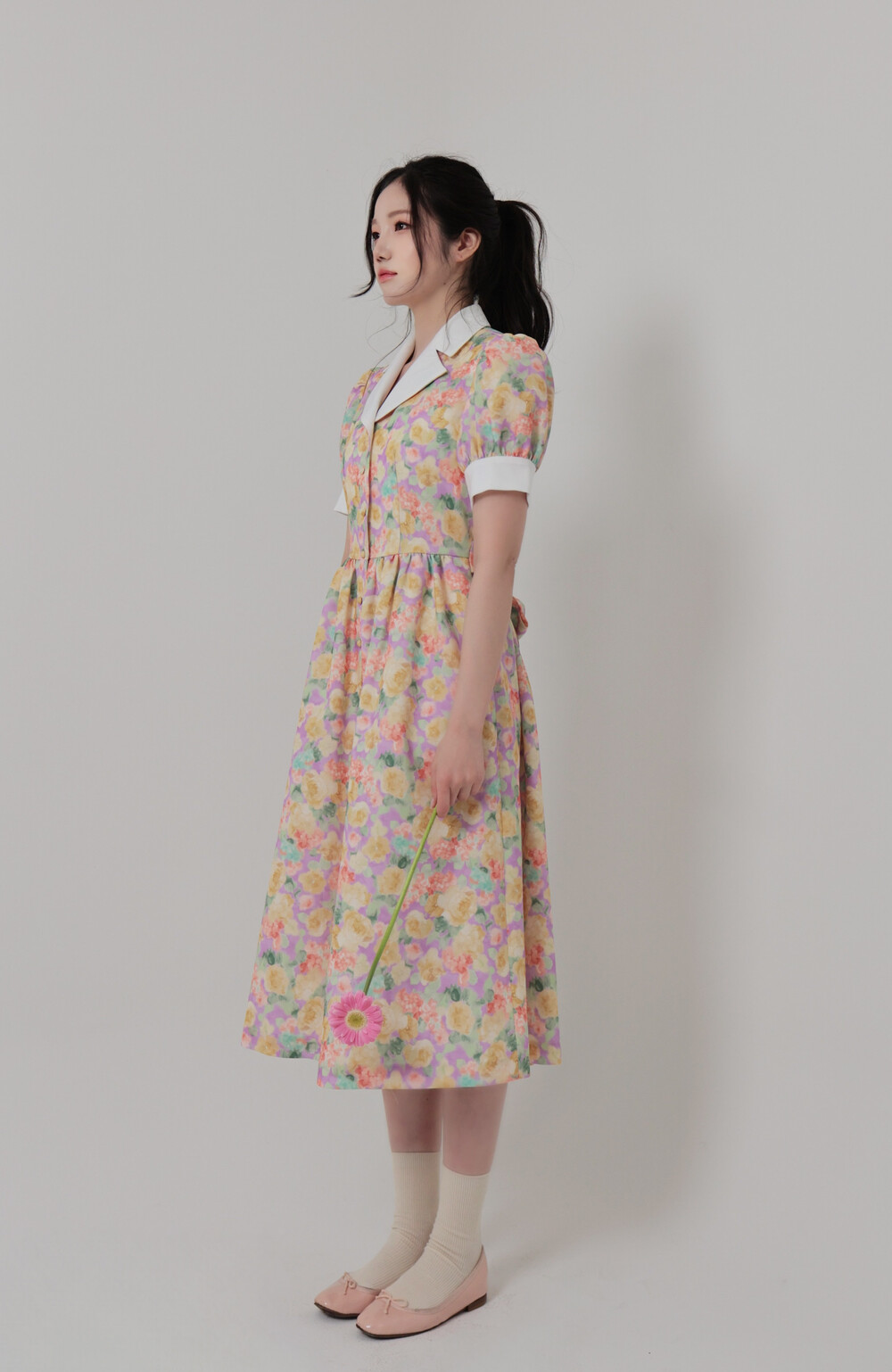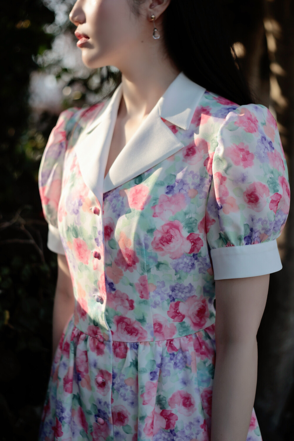 디자인 특징: 퍼프 소매, 허리끈 조절 가능, 빈티지 느낌의 카라 디테일