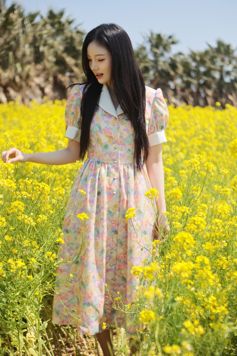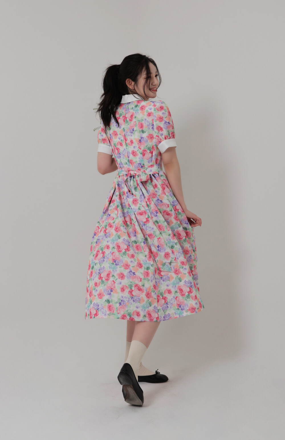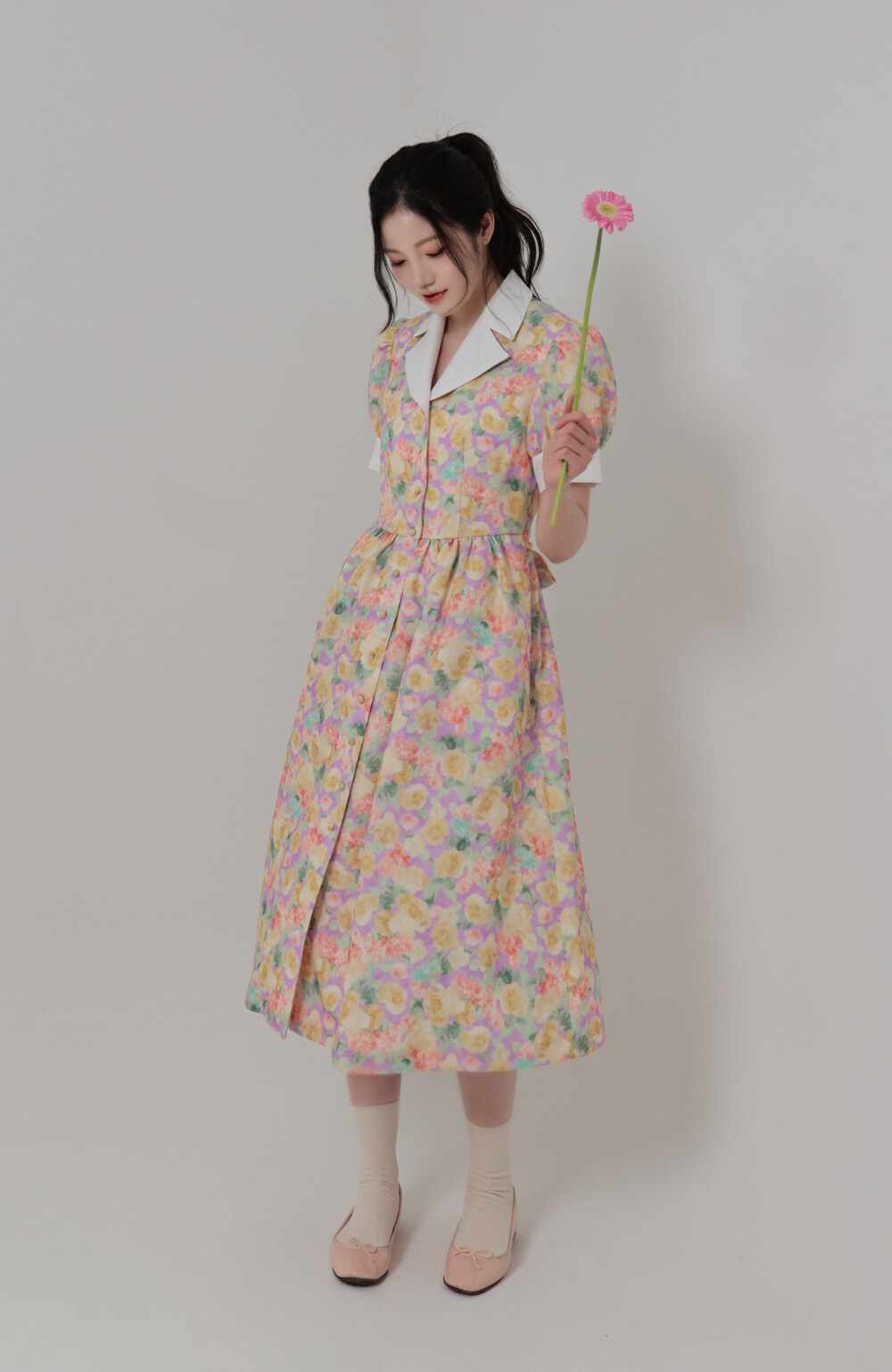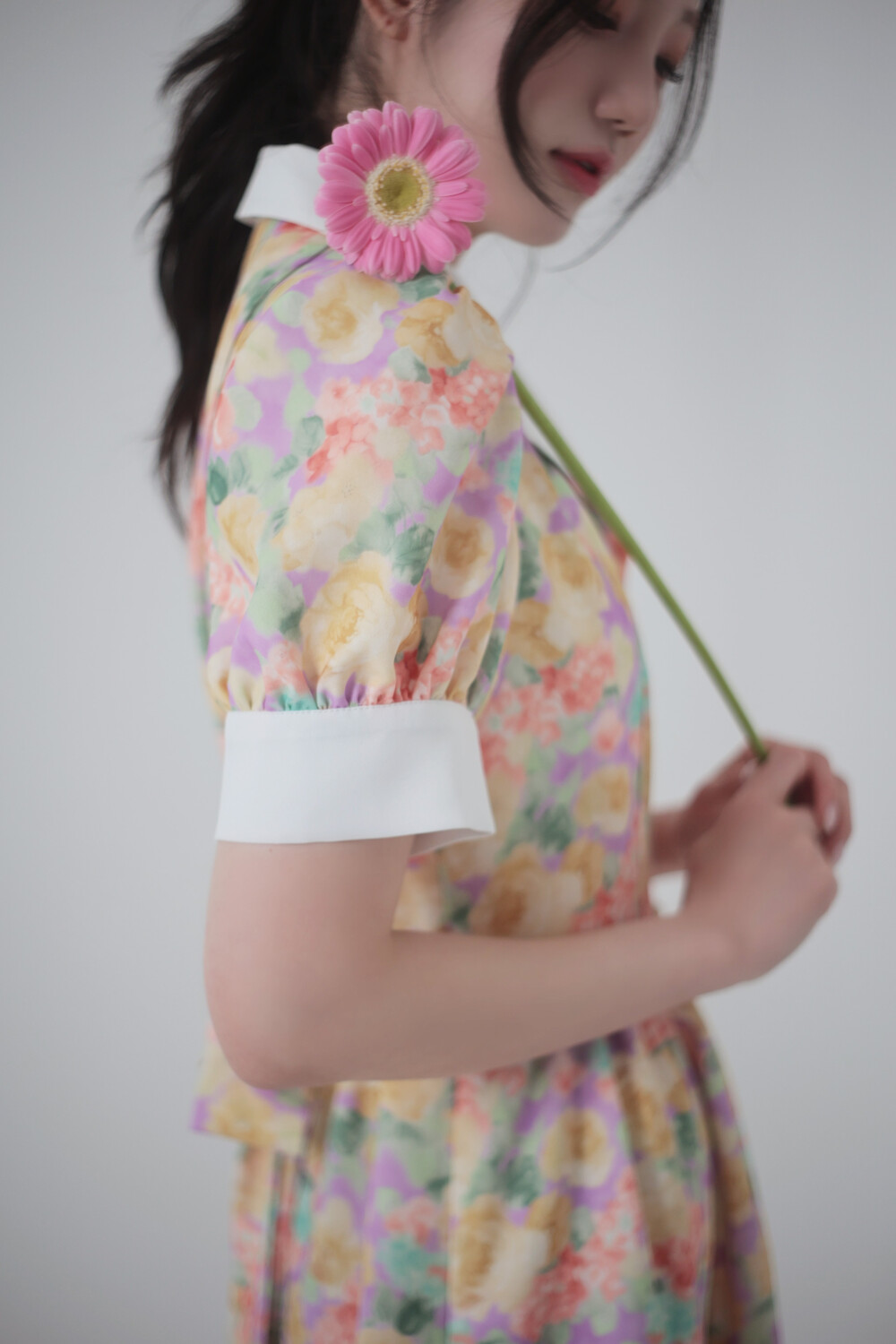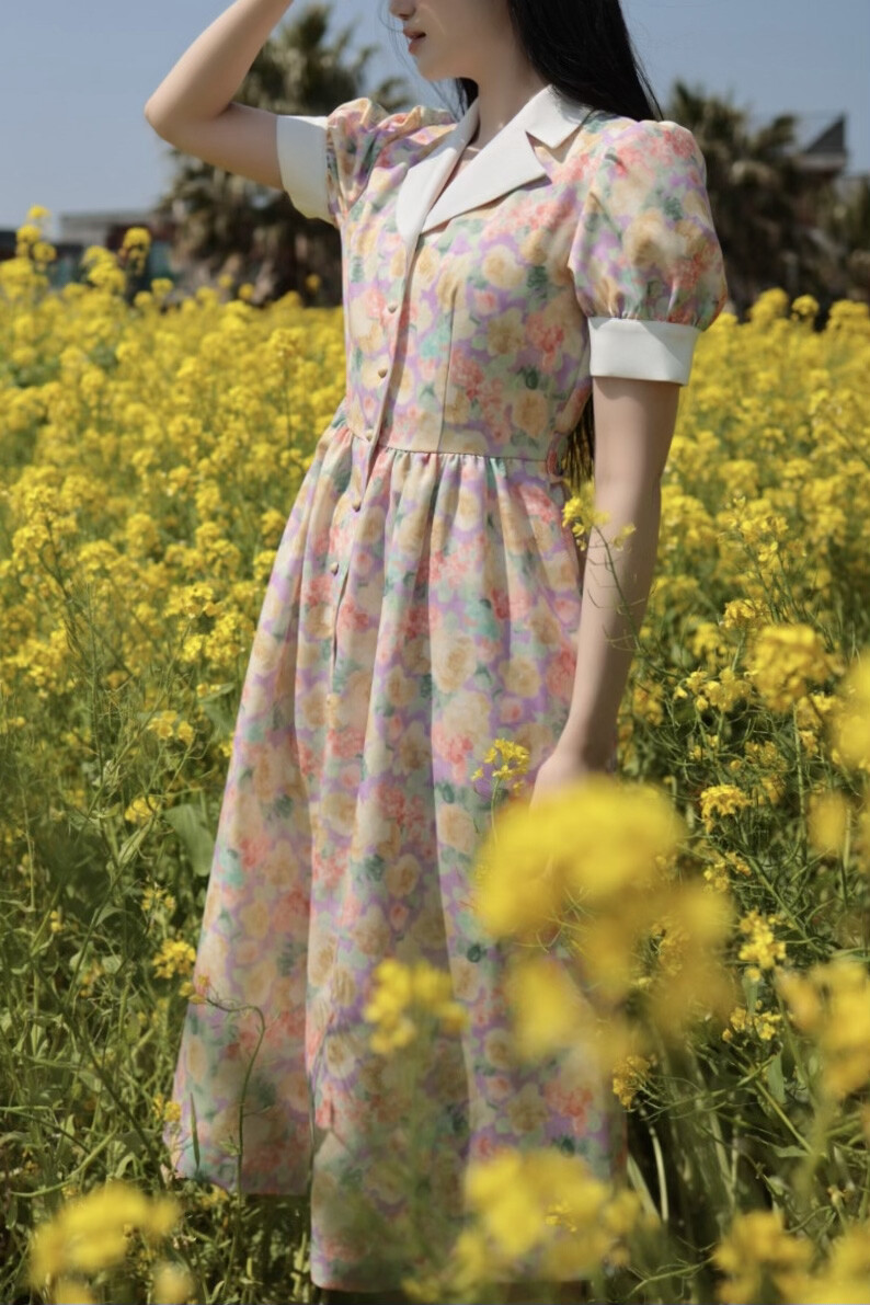 디자인 특징: 퍼프 소매, 허리끈 조절 가능, 빈티지 느낌의 카라 디테일