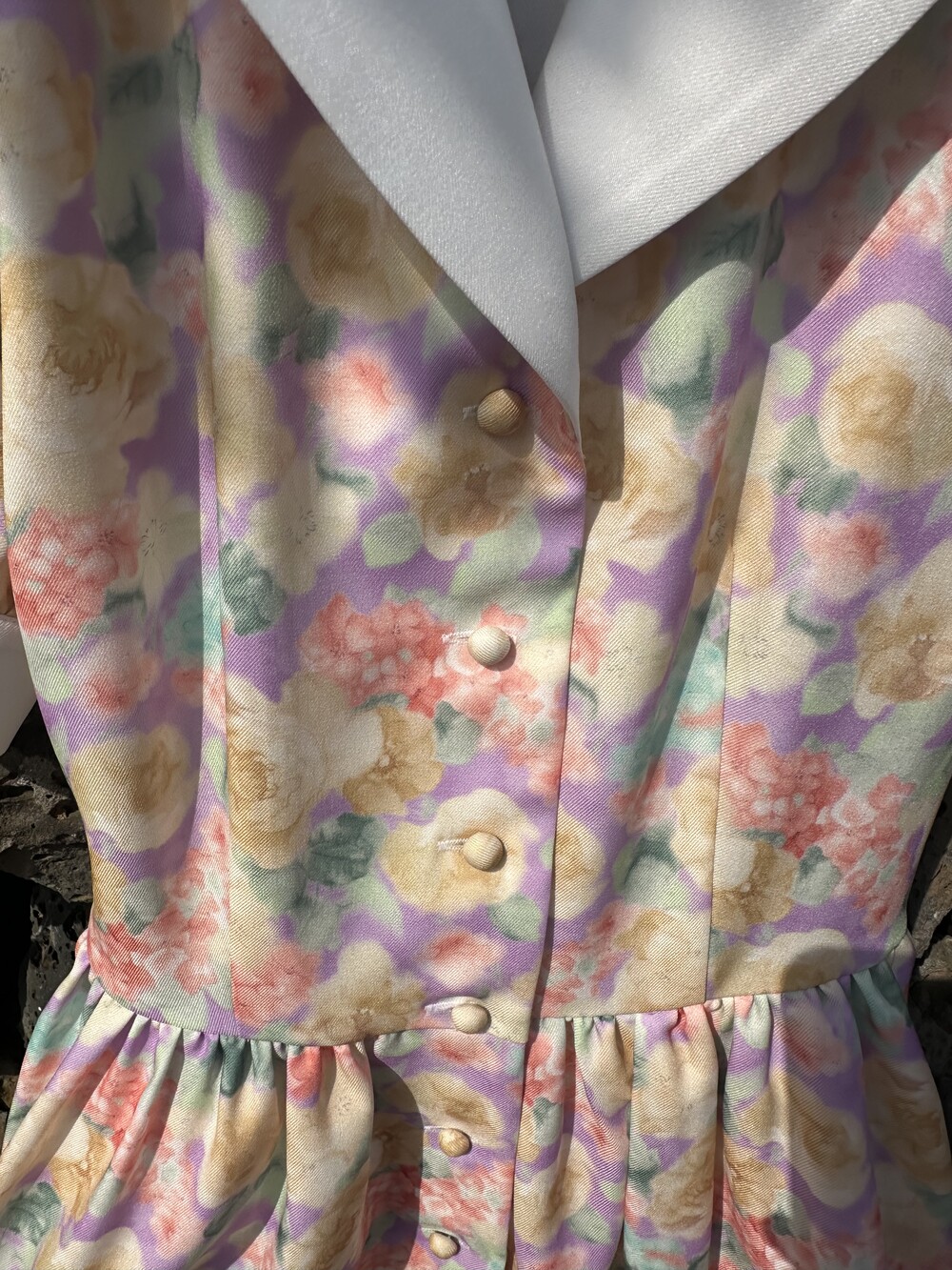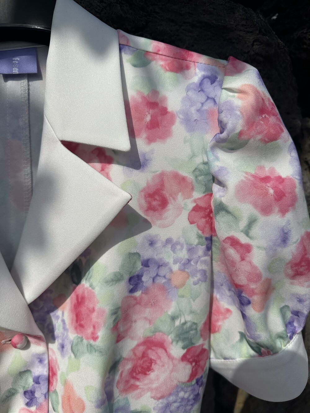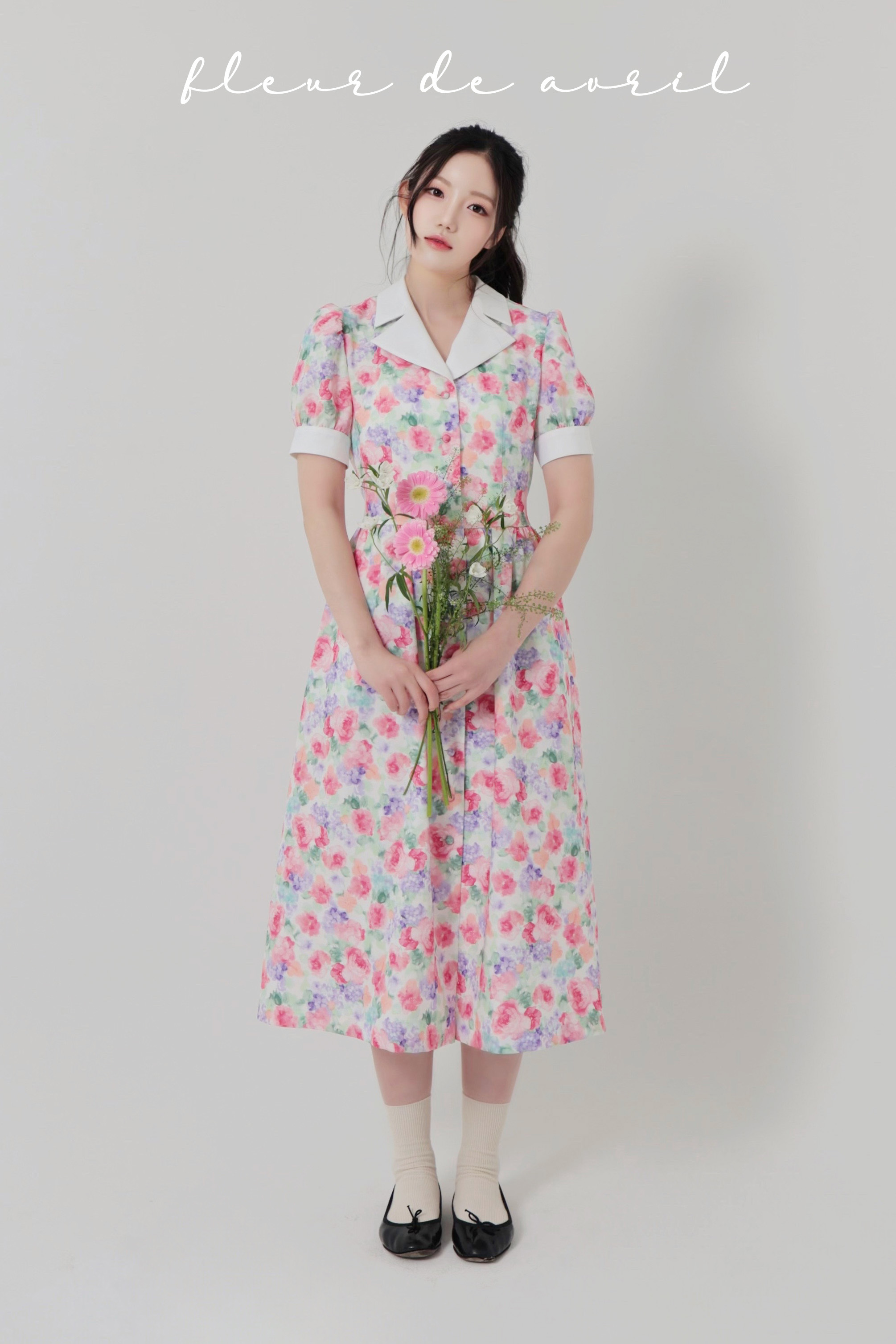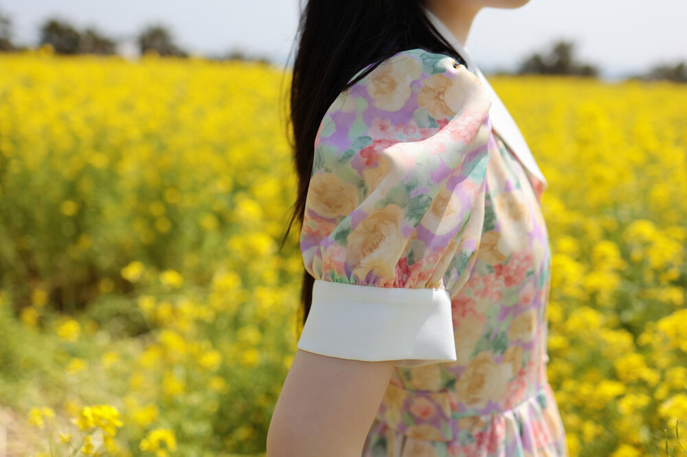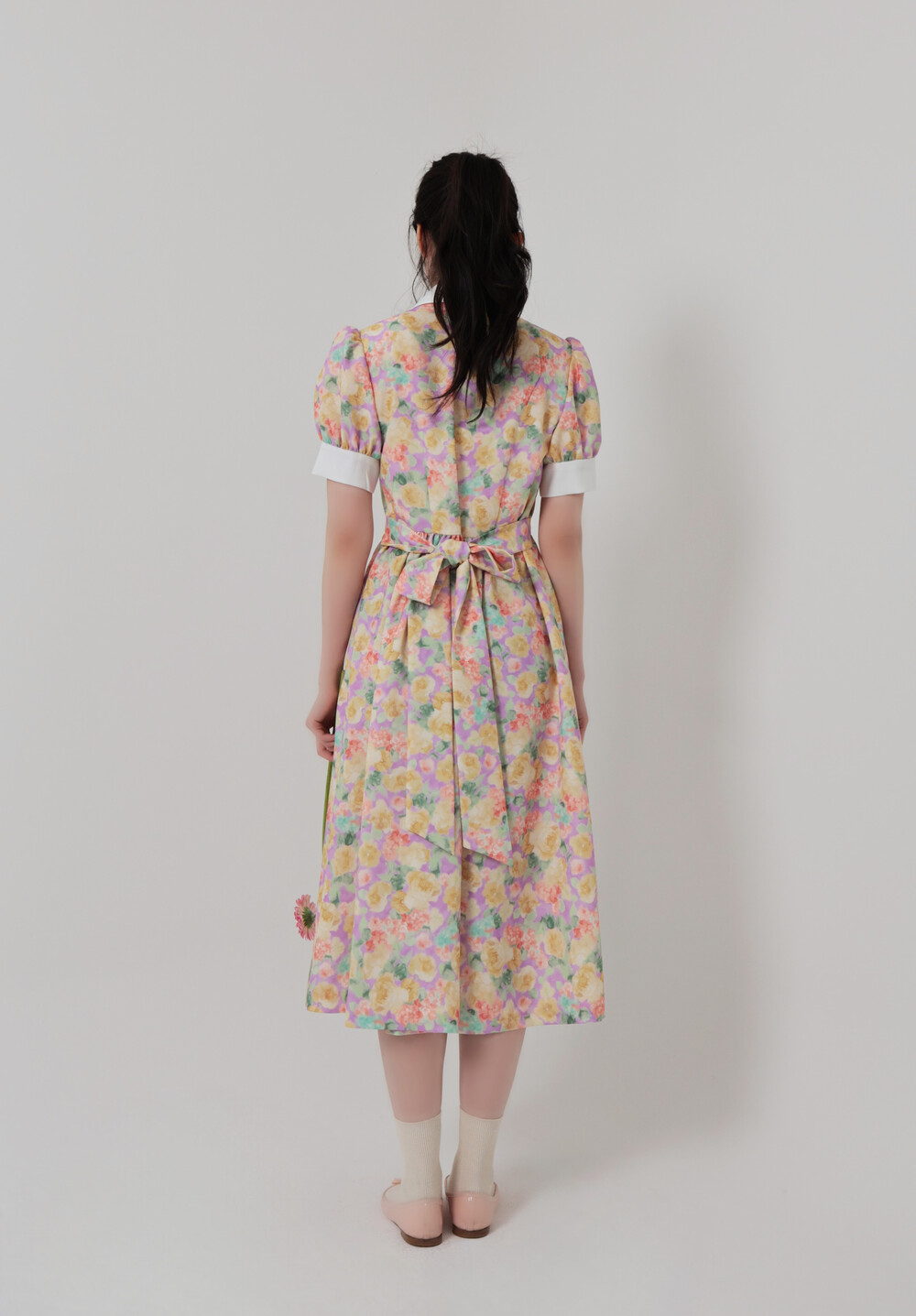 디자인 특징: 퍼프 소매, 허리끈 조절 가능, 빈티지 느낌의 카라 디테일